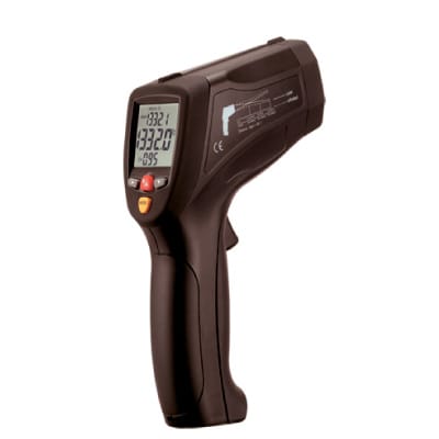 O Termômetro Infravermelho HTE-446A oferece leituras mais rápidas, fáceis e precisas para a maioria das medições de temperatura de superfície com dois pontos de laser. Os dois pontos de laser convergem em um único ponto quando a unidade está na distância otimizada com relação ao objeto medido.